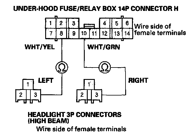 11. Check for continuity between the No. 3 terminal of the headlight (high beam) 3P connectors and the No. 8 (left headlight) or No. 10 (right headlight) terminals of the under-hood fuse/relay box 14P connector H.