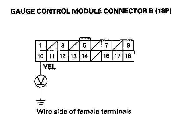 6. With gauge control module connector B (18P) still connected, check for voltage between the No. 10 terminal and body ground.