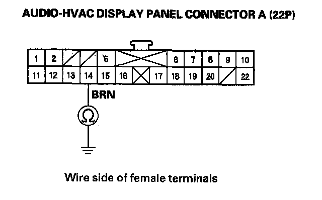 8. Check for continuity between the No. 14 terminal of audio-HVAC display panel connector A (22P) and body ground.