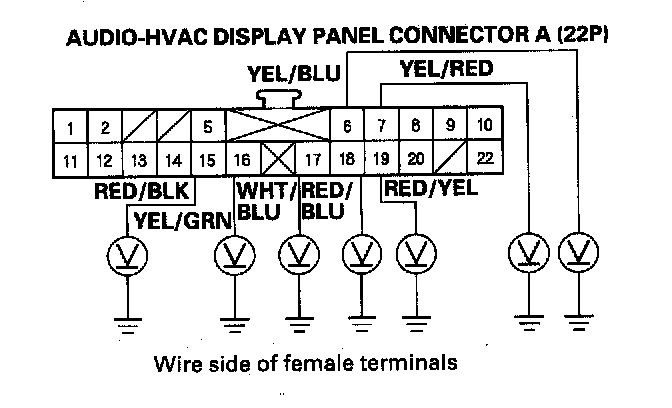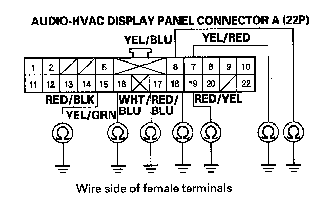 8. Check for continuity between body ground and audio-HVAC display panel connector A (22P) terminals No. 6, 7, 15, 16, 17, 18 and 19 individually.