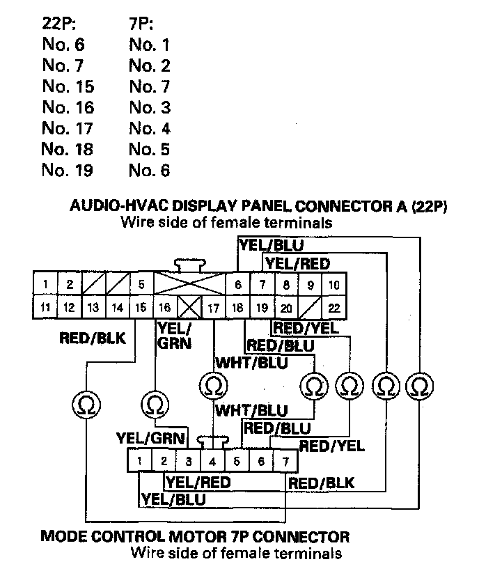 10. Turn the ignition switch OFF, and check for continuity between following terminals of audio-HVAC display panel connector A (22P) and the mode control motor 7P connector.
