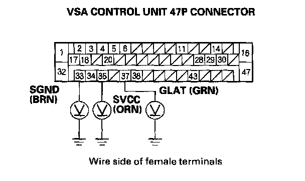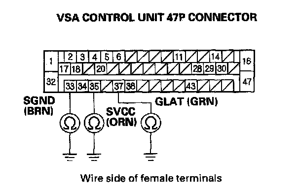 11. Check for continuity between body ground and the VSA control unit 47P connector terminal No. 33, No. 35, and No. 37 individually.