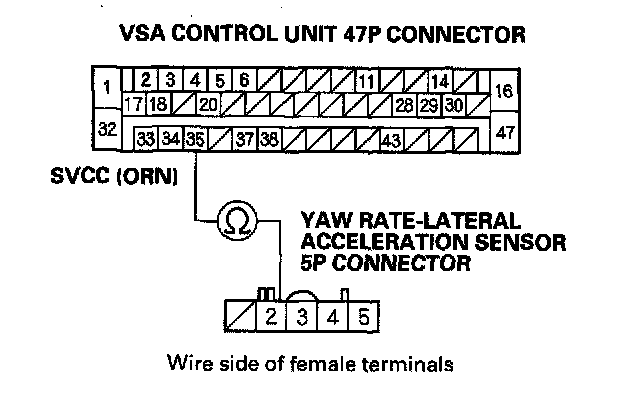 12. Check for continuity between the VSA control unit 47P connector terminal No. 35 and yaw rate-lateral acceleration sensor 5P connector terminal No. 2.