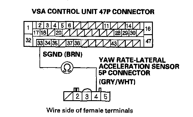 13. Check for continuity between the VSA control unit 47P connector terminal No. 33 and yaw rate-lateral acceleration sensor 5P connector terminal No. 4.