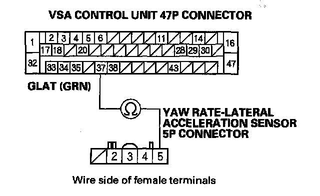 14. Check for continuity between the VSA control unit 47P connector terminal No. 37 and yaw rate-lateral acceleration sensor 5P connector terminal No. 5.