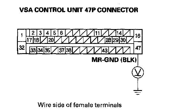 2. Measure the voltage between the VSA control unit 47P connector terminal No. 47 and body ground.