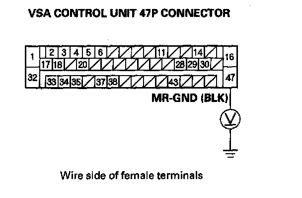 2. Measure the voltage between the VSA control unit 47P connector terminal No. 47 and body ground.