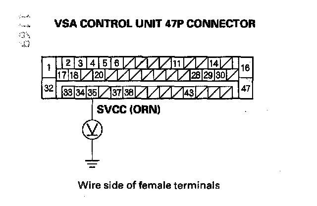 8. Measure the voltage between the VSA control unit 47P connector terminal No. 35 and body ground.