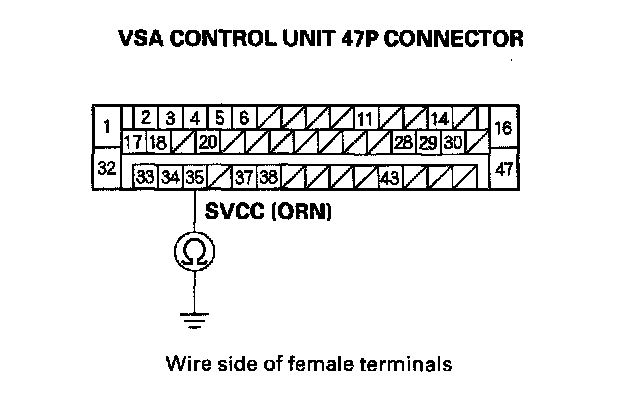 9. Check for continuity between the VSA control unit 47P connector terminal No. 35 and body ground.