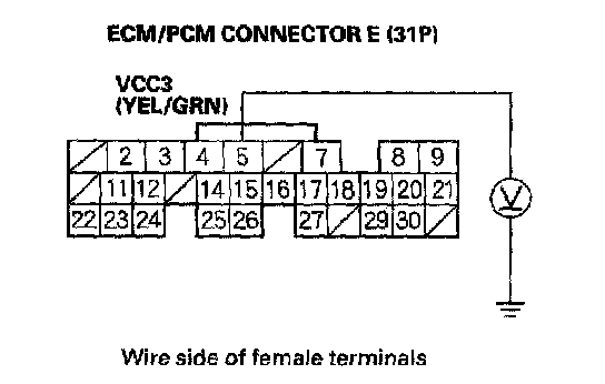 15. Measure voltage between ECM/PCM connector terminal E5 and body ground.