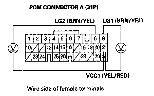 24. Measure the voltage between PCM connector terminals A21 and A8 or A9.