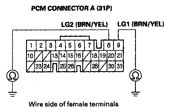 8. Check for continuity between PCM connector terminals A8 and body ground, and between A8 and body ground.