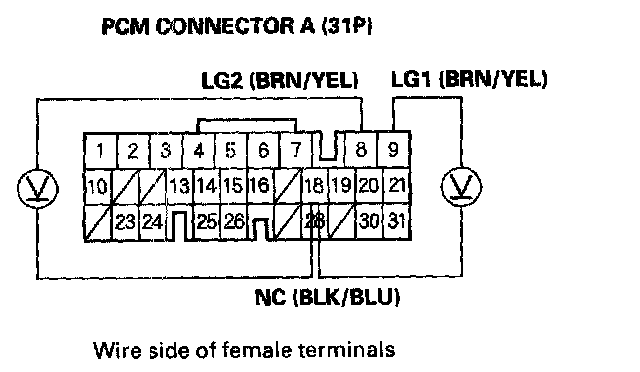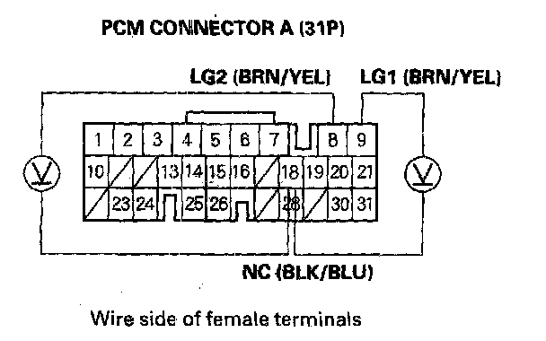 28. Measure the voltage between PCM connector terminals A18 and A8 or A9.