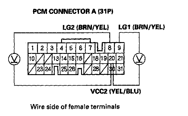23. Measure the voltage between PCM connector terminals A20 and A8 or A9.