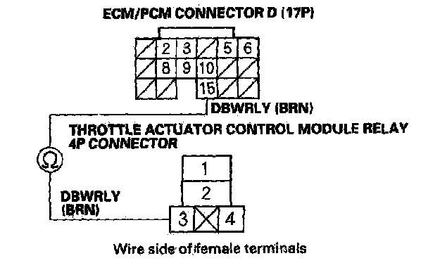 30. Check for continuity between ECM/PCM connector terminal D15 and throttle actuator control module relay 4P connector terminal No. 3.