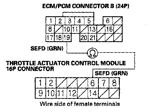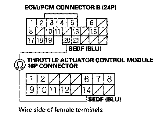 39. Check for continuity between ECM/PCM connector terminal B19 and throttle actuator control module 16P connector terminal No. 6.