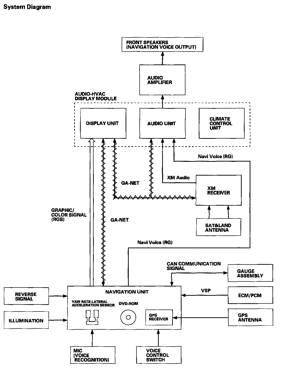The GA-NET bus provides communication between the navigation unit and the display unit. This bus also links the components in the audio-HVAC display module. The bus is used to pass button and touch-screen commands to the navigation unit. In addition, muting and voice control commands are sent to the display unit and the audio and climate control systems for processing. The audio unit uses the bus to control the XM-receiver or other accessories.