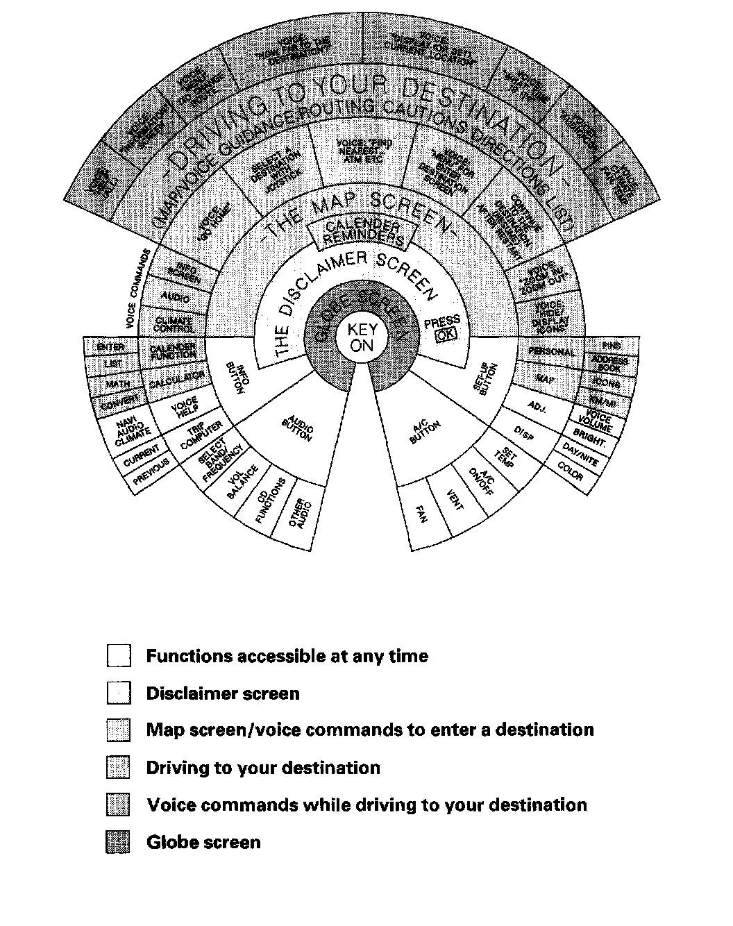 This diagram shows the features of the navigation system starting at the center and working outward in layers. The navigation program starts at "Key ON", and then displays the globe screen. Once the disclaimer screen is acknowledged, the next shaded portions of the diagram become active. However, some functions of the INFO and SET UP buttons, and all functions of the AUDIO and A/C buttons can be accessed immediately after the globe screen (white).