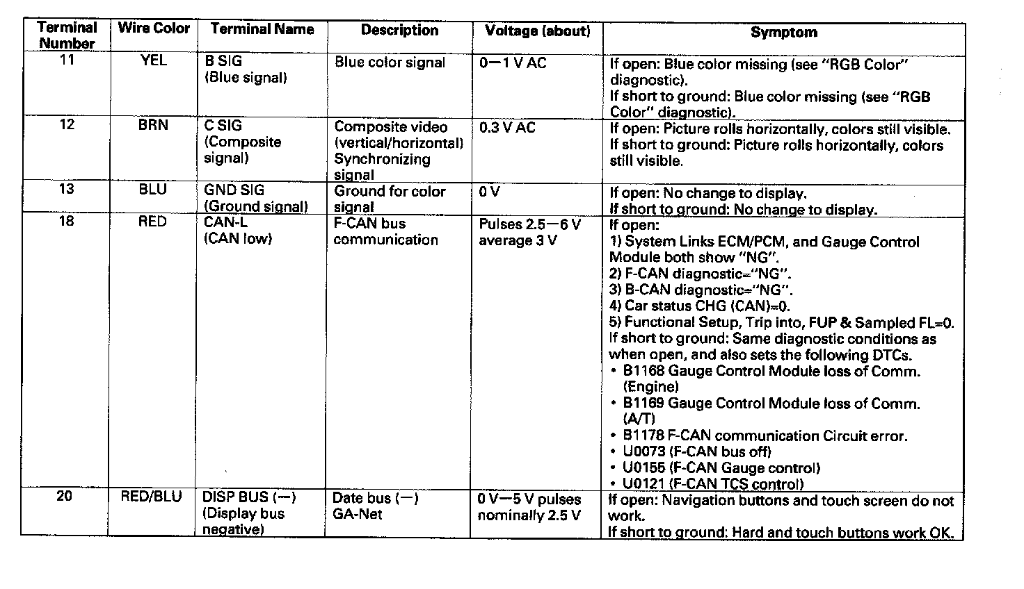 Display Unit Inputs And Outputs For 20P Connector: