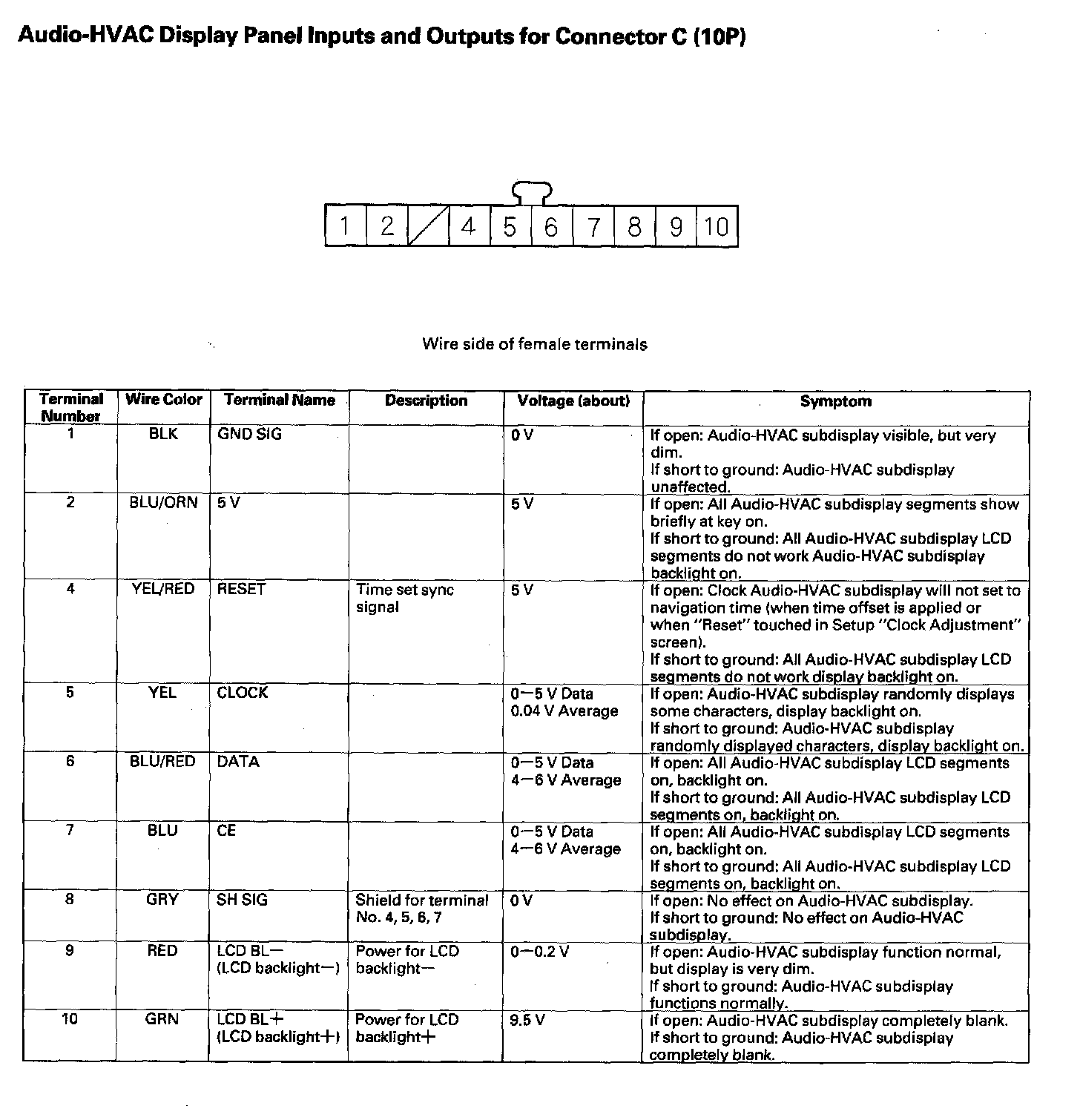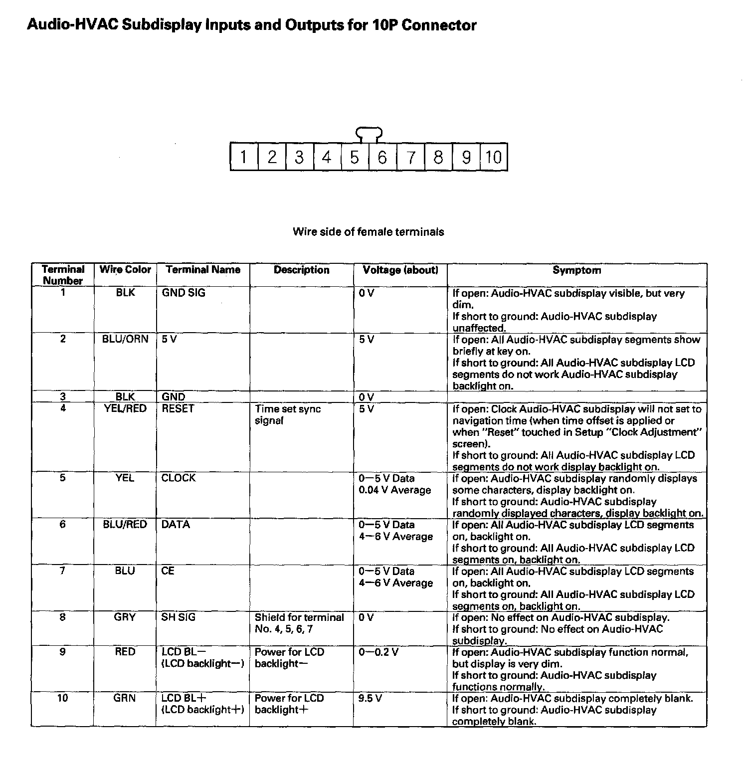 Audio-HVAC Subdisplay Inputs And Outputs for 10P Connector: