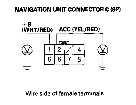 5. Measure the voltage between body ground and navigation unit connector C (8P) terminals No. 1 and No. 2 individually.