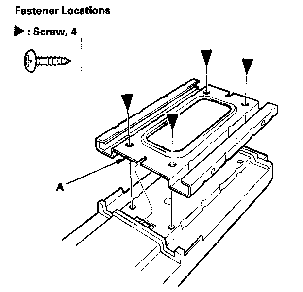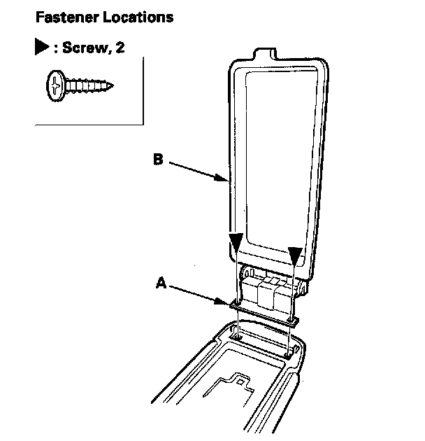 2. Remove the screws, then remove the armrest hinge (A) and the console tray (B) as an assembly.