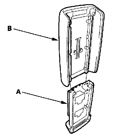 6. Remove the console armrest (A) from the guide rails of the console armrest base (B).