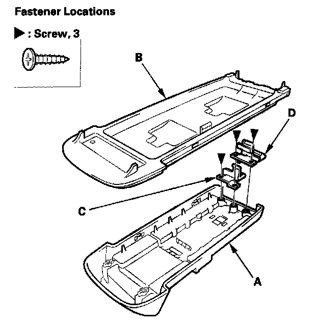 8. Separate the console armrest upper base (A) from the lower base (B). Remove the screws, then remove the armrest lock (C) and the tray lock (D) from the upper base.