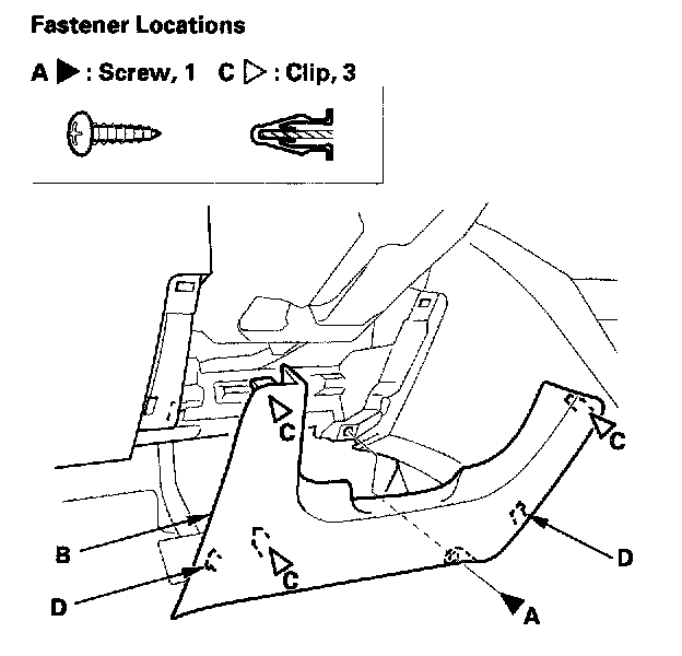 2. Remove the screw (A). Gently pull out on the lower edge of the dashboard lower cover (B) to detach the clips (C) and hooks (D).