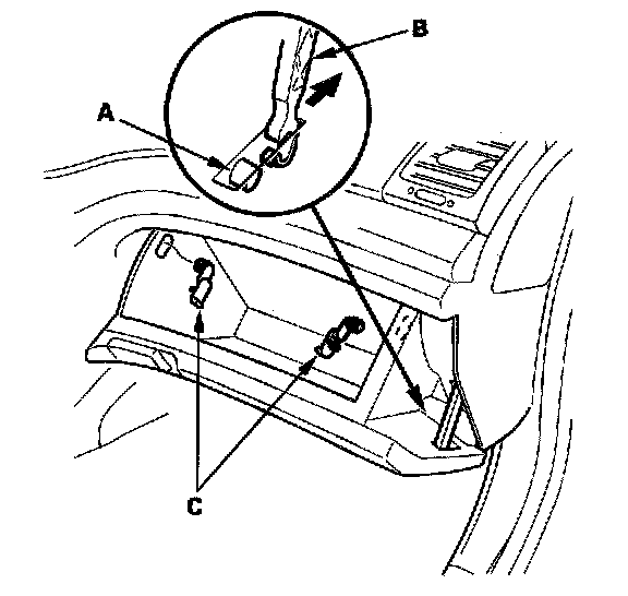 1. Detach the hook (A) of the glove box damper (B), and remove the glove box stop (C) on each side.