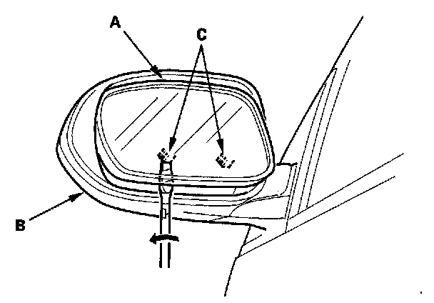 2. Put a shop towel in the opening between the lower edge of the mirror holder and the mirror housing (B) to prevent scratches, and detach the bottom clips (C) with a flat-tip screwdriver wrapped with protective tape.