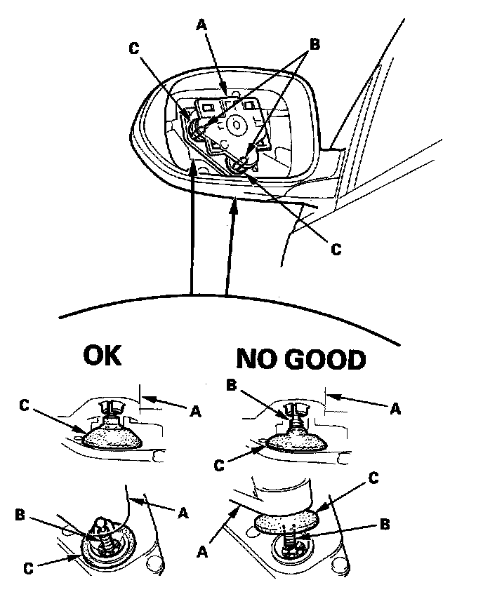 5. Before reinstalling the mirror holder to the inner holder (A) of the actuator, check the actuator rods (B) and the actuator boots (C):