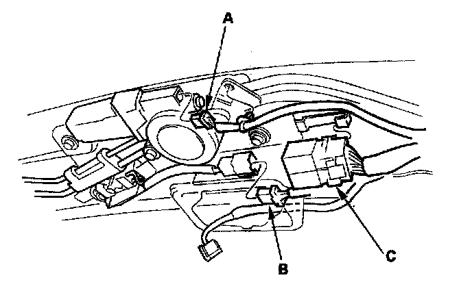 3. Put on gloves to protect your hands. Disconnect the motor connector (A), open/close-tilt/close switch connector (B), and remove the moonroof relays (C).