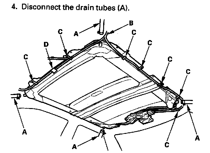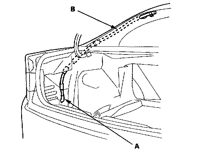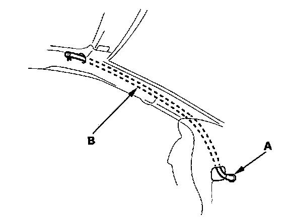 Tie a string to the top end of the rear drain tube (B), then pull back the trunk side trim panel and pull the drain tube down out of the pillar leaving the string inside the pillar.