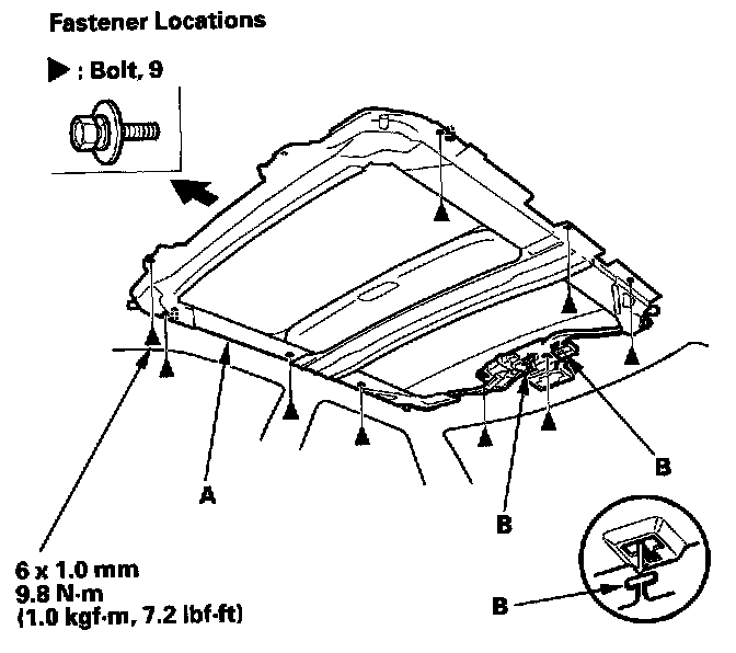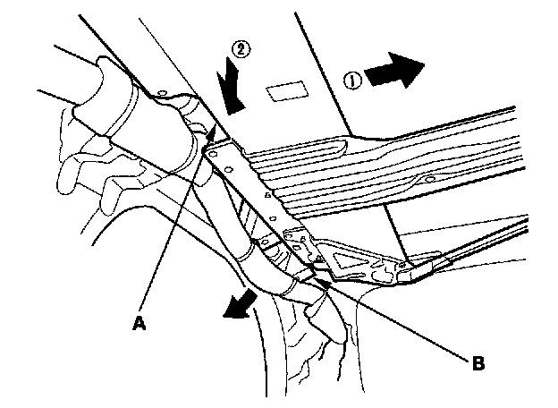 6. With an assistant holding the frame (A), remove the bolts, starting at the rear, and release the rear hooks (B) by moving the frame forward.