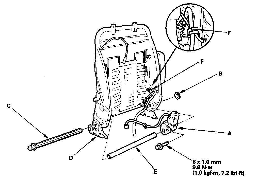 4. Remove the bolt and clamp (F), then remove the recline motor.