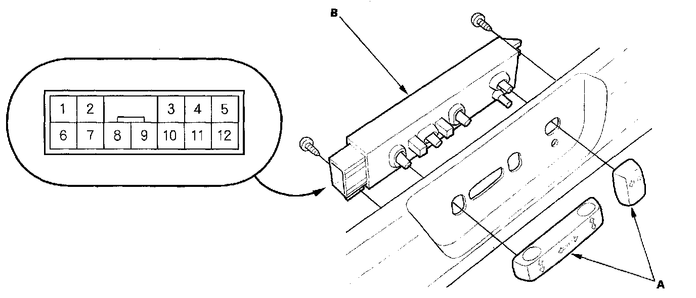 1. Remove the power seat adjustment switch knobs (A) and recline cover from the front passenger's power seat, then remove the two screws and the power seat switch.