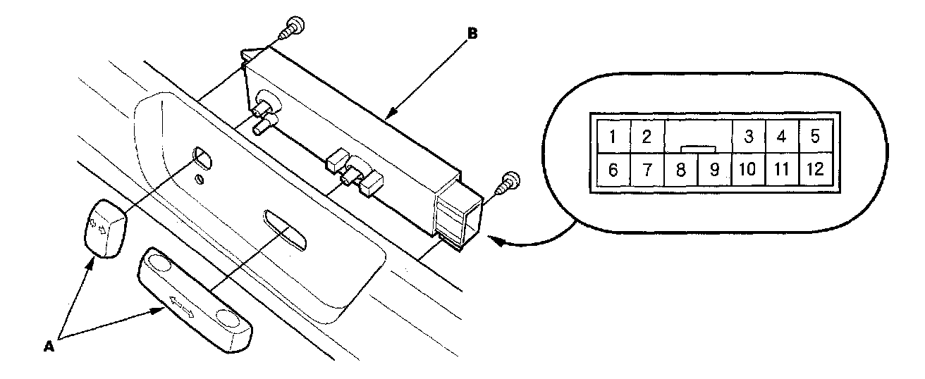 1. Remove the power seat adjustment switch knobs (A) and recline cover from the driver's power seat, then remove the two screws and the power seat switch.