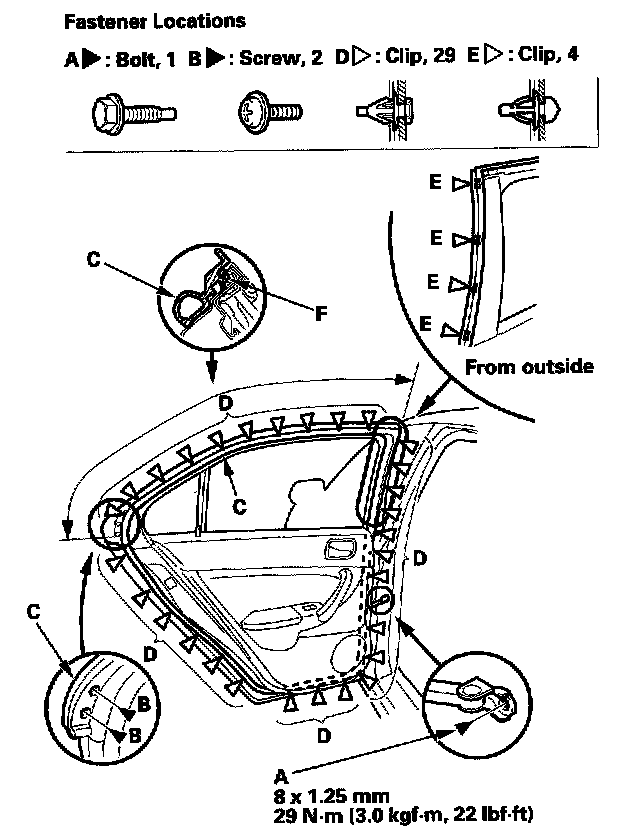 - Make sure the weatherstrip is installed in the holder (F) securely.