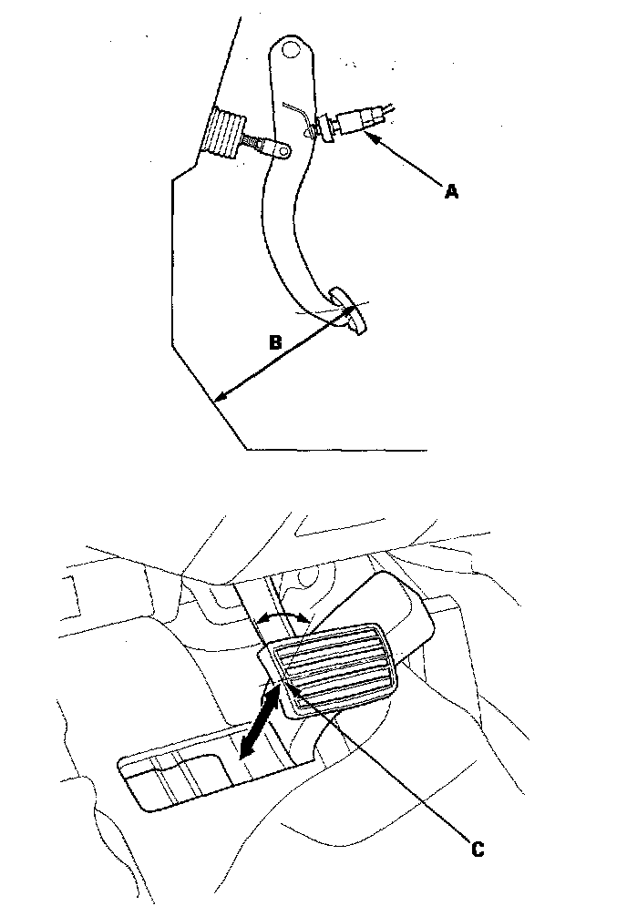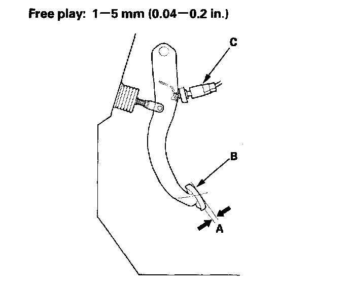 2. If the pedal free play is out of specification, adjust the brake pedal position switch (C). If the pedal free play is insufficient, it may result in brake drag.