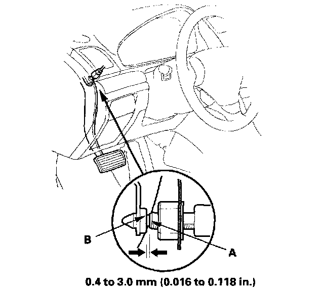 1. Turn the brake pedal position switch (A) counterclockwise, and pull it back until it is no longer touching the brake pedal.