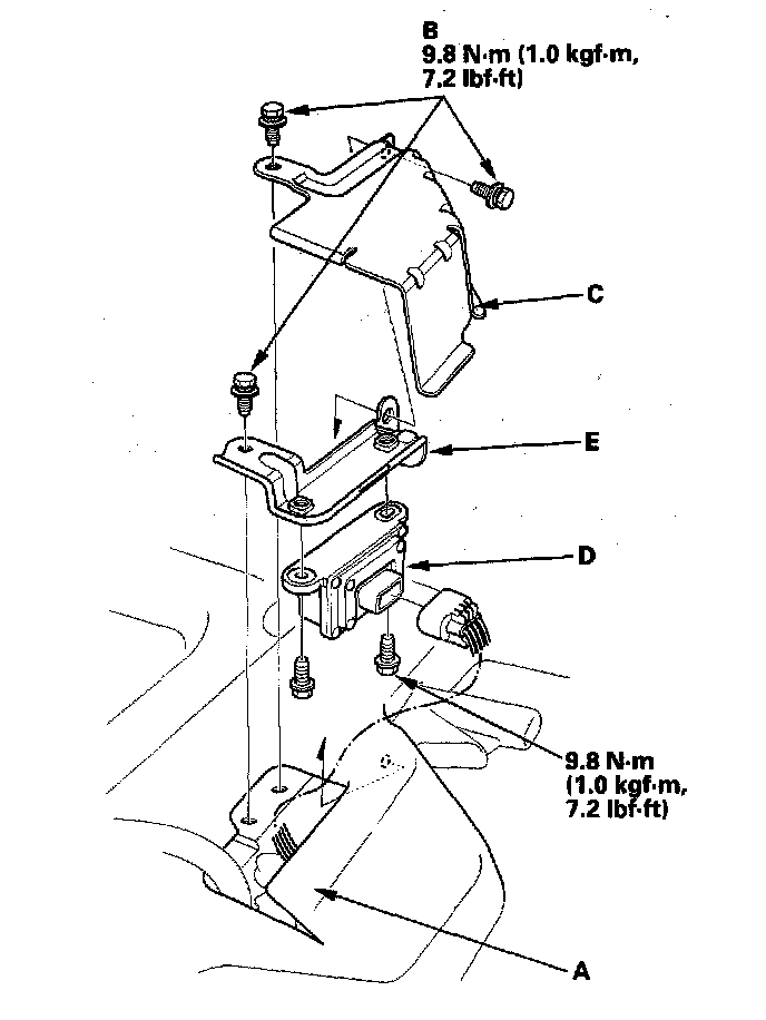 5. Remove the yaw rate-lateral acceleration sensor (D) with the bracket (E).