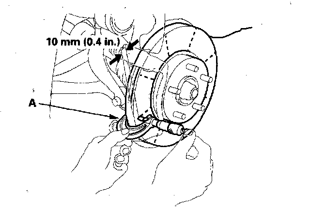 5. Set up the dial gauge against the brake disc as shown, and measure the runout at 10 mm (0.4 inch) from the outer edge of the disc.