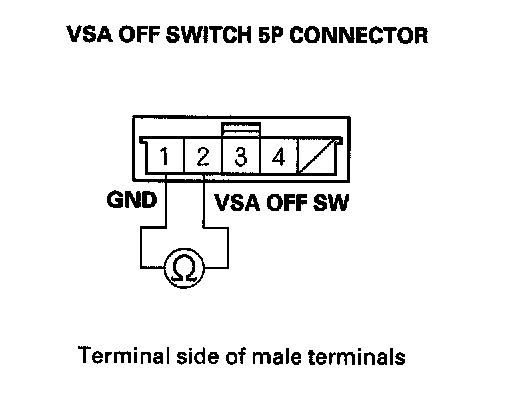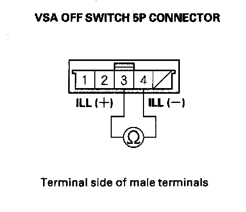 4. Check for continuity between the VSA OFF switch 5P connector terminal No. 3 and No. 4. There should be continuity at all times.