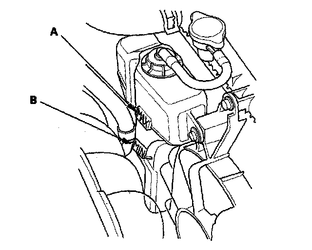 1. Look at the coolant level in the reserve tank. Make sure it is between the MAX mark (A) and MIN mark (B).