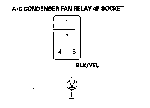 4. Measure the voltage between the No. 3 terminal of the A/C condenser fan relay 4P socket and body ground.