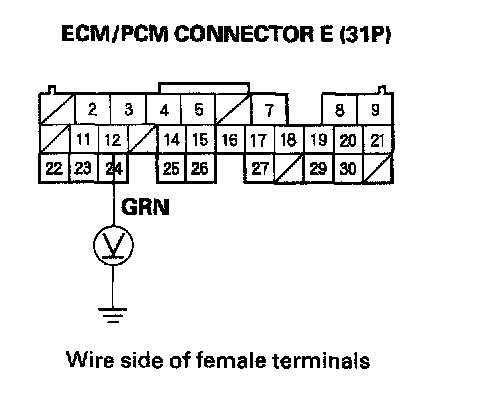 9. Using a backprobe set, measure the voltage between the No. 12 terminal of ECM/PCM connector E (31P) and body ground with the ECM/PCM connectors connected.