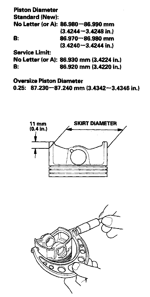 3. Measure the piston diameter at a point 11 mm (0.4 inch) from the bottom of the skirt. There are two standard-size pistons (No Letter or A, and B). The letter is stamped on the top of the piston. Letters are also stamped on the block as cylinder bore sizes.