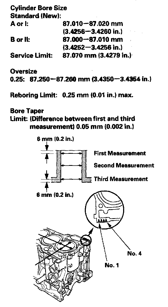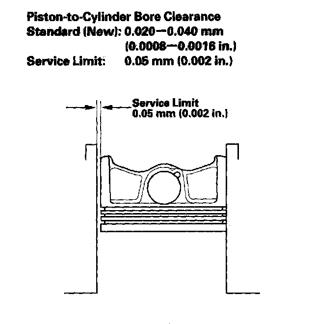 7. Calculate,the difference between the cylinder bore diameter and the piston diameter. If the clearance is near or exceeds the service limit, inspect the piston, and engine block for excessive wear.
