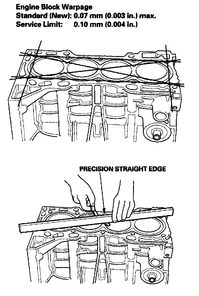 6. Check the top of the block for warpage. Measure along the edges and across the center as shown.